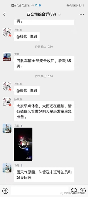 一是信息共享。總公司通過(guò)微信群、車內(nèi)監(jiān)控、GPS定位等手段,及時(shí)將線路運(yùn)行情況、危險(xiǎn)路段道路積水情況、場(chǎng)站排水情況等信息進(jìn)行共享聯(lián)動(dòng),以確保及時(shí)準(zhǔn)確下達(dá)工作指令。